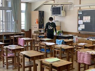 来週の分散登校に向けて,みなさんが気持ちよく生活することができるように,学校の中を見直しているところです。今日は,教室の机の配置を見直しました。