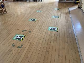 学校再開に向けて,校内の環境整備を進めています。水道やトイレも並ぶ時に3密を避けるために,写真のような工夫をしています。