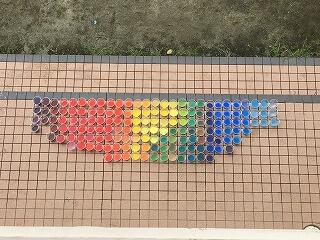 色水は、赤、青、黄の三原色の絵の具を使い、ペットボトルに入れた水をコップに入れ、作りました。