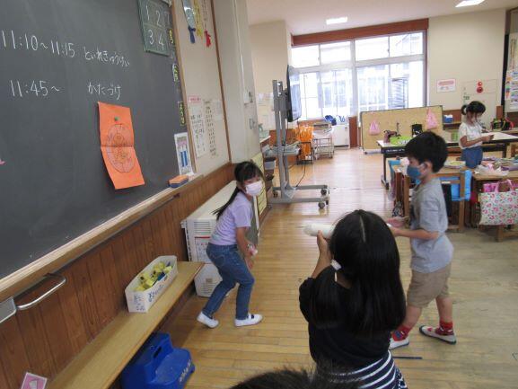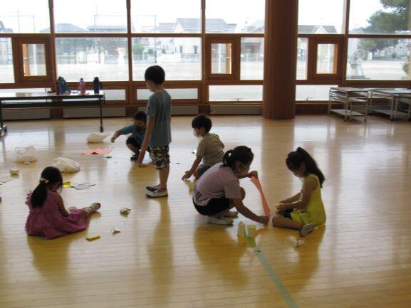 シャボン玉では、ハンガーを使って大きなシャボン玉をとばしたり、うちわや数本を束ねたストローでたくさんのシャボン玉をとばしたりしました。