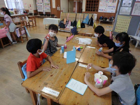 水鉄砲では、的に向かって、水をとばしました。マヨネーズの容器や蓋に穴をあけたペットボトル、台所用洗剤の容器などを水鉄砲にしました。