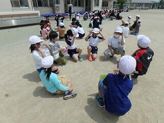 5月12日(水)に1年生を迎える会を行いました。校庭でなかよし班ごとに集まり,「西小クイズ」と「食べ物しりとり」をしました。1年生は,上級生と一緒に活動するこができ,とても嬉しそうな様子でした。
