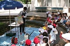 本日の昼休みの時間に、ランチルーム北側のけやきの木広場で、読み聞かせイベントを実施しました。