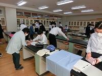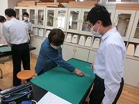 本日は布地をカットするところを行いました。生徒それぞれが希望する布地を寸法にあわせてカットしていきます。縫いしろをとる幅など、丁寧なアドバイスを受けていました。