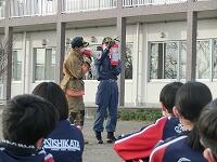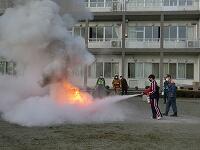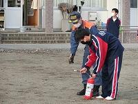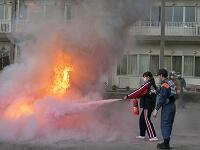 避難訓練を行いました。地震発生後の火災を想定して、全生徒・職員が校庭に避難しました。避難後、消防署職員の方の指導を受けて、消火器の使い方を実習しました。実際に火を燃やして体験しましたが、炎に近寄る経験は少ないので、かなり恐怖心があったようです。正しい消火器の使い方を理解し、消火活動を行いました。