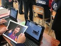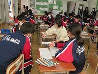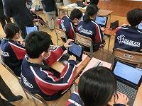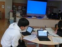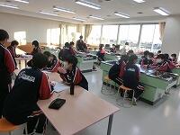 学力向上に向けて、校内で授業研究会を行いました。今回は英語の授業です。英語で話すだけでなく、タブレットのアプリを使って、英語のクイズを作成しながら「現在完了形」の文章構成を学びました。授業後「言いたいことが考えついても、過去分詞を調べたりするのが大変だった。」の感想があり、ねらいに迫った授業となりました。