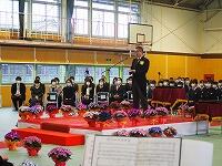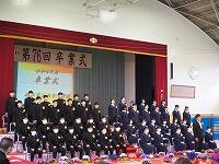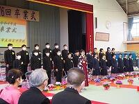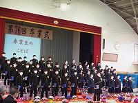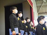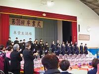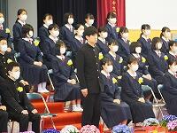 第76回 卒業式が挙行されました。今年は、全校生徒が参加しての卒業式となりました。入退場及び卒業証書授与では卒業生はマスクを外して顔を見せて行うなど、式の内容も少しずつコロナ流行以前の形に戻しました。学校運営協議委員の皆様やPTA会長、PTA本部役員の皆様を来賓としてお迎えしました。