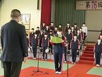 校歌を1番のみ斉唱しました。久しぶりに聴く全校生徒による校歌でした。この後教室に戻り、一人一人に学級担任の先生から通信票が手渡されました。