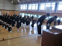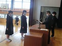 修了式を体育館で行いました。修了書が校長先生からクラスの代表生徒に手渡されました。校長先生からは、山本有三の「「竹」は土の下でしっかりと手をにぎり合って」の一節から、「支え合う」ことの話がありました。また、一年間のこだわりのシートから、こだわりをもつことでたくさん成長できたとする生徒の自己評価を賞賛しました。