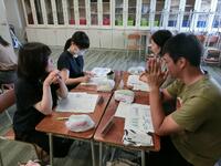 今日のコミトレは「中華料理をつくろう」です。まず、「お品書き」を確認して、カードをグループで配ります。みんなで「注文!」とかけ声をかけ、「メン」や「ラー」「シュー」「マイ」などの手持ちのカードを出しながら、お品書きの料理名をつくっていきます。手持ちのカードがなくなった人から勝ちになっていきます。なかなか手持ちのカードを出すタイミングが難しかったようです。