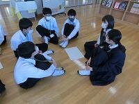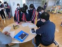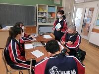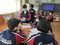 生徒会集会では、最後の縦割りによる活動を行いました。一年間を通して、縦割りの活動を行い、学年を越えた交流ができるようにしようという生徒の思いからできた活動です。今回は「朝からそれ正解」と題して、同じ文字で始まる言葉で「あたたかいもの」を連想して、話し合いました。