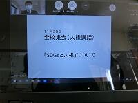 今回も全校集会は、タブレットを使ってのリモートで行いました。現在話題となっている「SDGsと人権~ジェンダー平等~」等についての話がありました。世界と日本のジェンダー問題を知り、これから自分が何をしていけばよいのかを考えました。