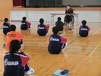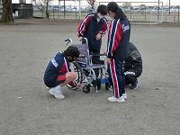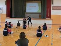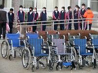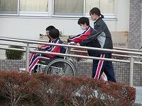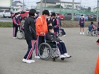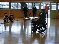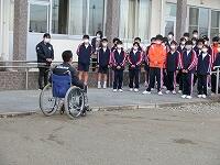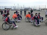 1年生は、総合的な学習の時間に「障がい者の理解」について、社会福祉協議会の方からお話をいただきました。その後、校庭で車椅子体験をしたり、車椅子に乗っている人を介助する体験をしたりして、障がい者への理解を深めました。
