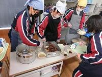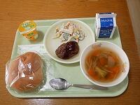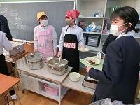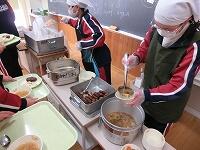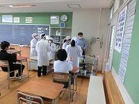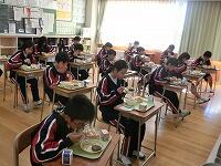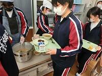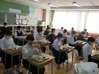 1年生は中学校での給食は初めてです。当番の生徒が手際よく配食していました。