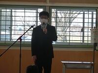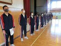 今日は第2学期終業式です。体育館で、冬休み中の学習や生活について、学習指導の先生、生徒指導の先生から話がありました。その後、終業式が行われました。校長先生は式辞の中で、2学期を振り返り、1年生、2年生、3年生へとそれぞれにメッセージを送りました。各学年代表者が行う意見発表では、2学期を振り返っての反省や成長したこと、次年度への抱負がありました。最後に全員で校歌1番を合唱しました。コロナ禍で全校生徒での合唱は避けていたので、全校生徒による校歌は1年生と2年生にとって中学校で初めての経験でした。