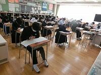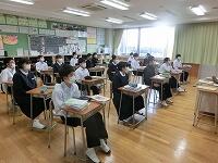 今日は全学年を対象に、英語のスピーキングテストが行われました。普段本校に勤務しているALTではなく、初対面のALTが4名来校して、一人一人面談しながらスピーキングテストを受けました。生徒は待っている時は緊張した面持ちでしたが、面談するとにこやかに対応していました。