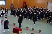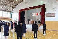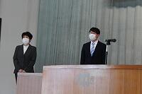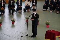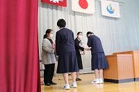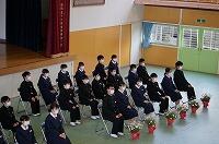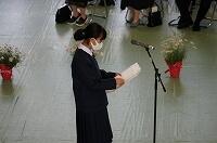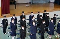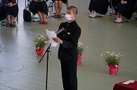 緊張した面持ちで入場しましたが、新入生認証では、呼名されると一人一人が元気に返事をしていました。校長式辞では、「三かん王(関心・感動・感謝)を目指すと共に、自分も他人も大切にできるように」という話がありました。その後、歓迎の儀では生徒会長からの歓迎のことばが、新入生代表生徒からは誓いのことばが述べられました。