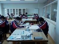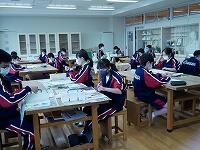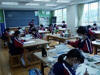 樹木を含む写真を見ながら、風景画を描く学習です。半数ほどの生徒が彩色に取り組みはじめました。先生に質問したり、助言を受けたりしながら、よりよい作品に仕上げようと集中して描く姿が見られました。