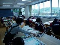 明日から中間テストです。今日のコミトレは、「中間テストみんなでがんばろう」ということで、各自テストに向けて学習を進め、質問事項を各教科の先生が答えるという内容です。多目的室に各教科の先生が待機し、生徒が持ってくる質問に丁寧に解説していました。