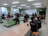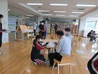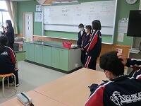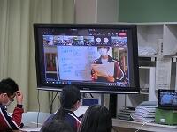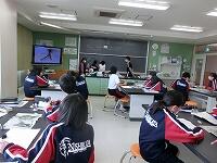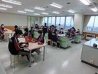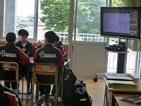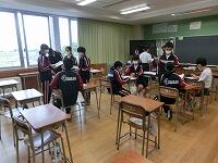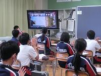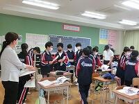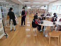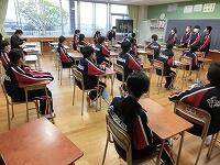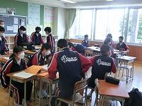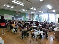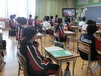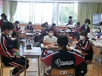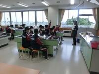 1年1組は英語の授業を参観しました。本時のねらいは疑問文をつくることで、生徒は友だちに英語で質問したり、答えたりして、熱心に取り組んでいました。