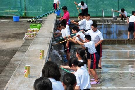 の上昇を待って、水泳の授業を行います。 梅雨時の授業なので、体調管