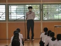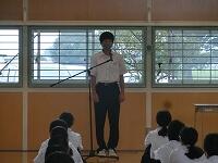 1学期終業式が行われました。校長先生からは米メジャーリーグの大谷選手が高校1年生の時に立てた目標についての話がありました。特に、ゴミを拾うなどメジャーリーガーになっても続けていることの紹介があり、将来の目標に向けて、多方面から分析して、目標に向かって努力することの大切さの話がありました。各学年からは代表生徒が1学期を振り返って成長したことや今後への抱負などの発表が行われました。