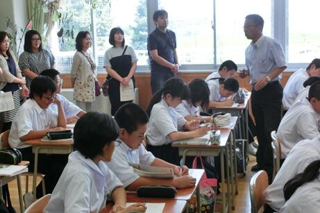 し、授業の様子や教育環境・掲示物等を見ていただきました。期末テス