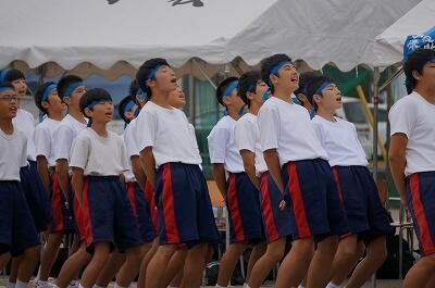 赤組・青組の応援団旗が披露され、団長を中心に運動会に向けての士気を高めました。