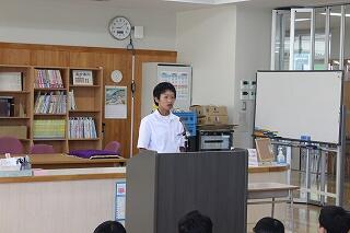 続いて校長先生のお話の後、各学年代表生徒と生徒会による意見発表がありました。