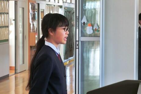を赤く染めた西方中生が学校にもどってきました。元気な挨拶は、いい冬