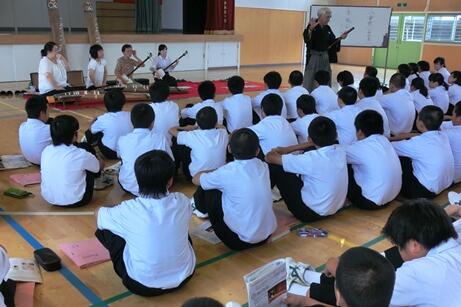 最初に、体育館で邦楽についての基本的な知識をお話いただいた後、