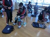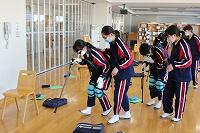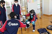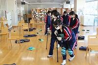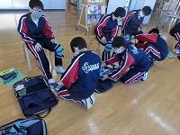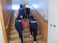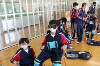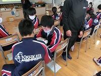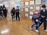 1年生は、総合的な学習の時間に福祉学習を進めています。本日は、1年1組の生徒が、社会福祉協議会の指導のもと高齢者体験を行いました。いろいろな装具を身に付けて、高齢者の気持ちになって校内を歩いてみました。また、介助としてどのようにすると良いのかを考えながら、グループ内で交替して体験しました。