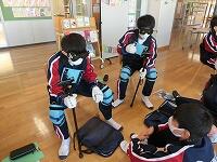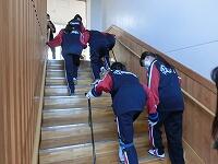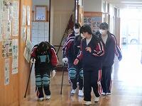 本日は、高齢者疑似体験2として、1年2組の生徒が実習しました。ねらいは、80代くらいになって、腰が曲がってきたり、視界が狭くなってきたりしてくると、どんなところが大変なのかを体験をとおして考えることです。足や腕に重りをつけ、杖を片手に校内を歩いてみました。介助役の人は、どんなところに気を配ると良いかを考えながら体験しました。
