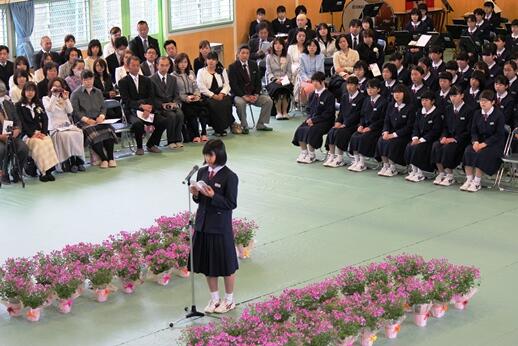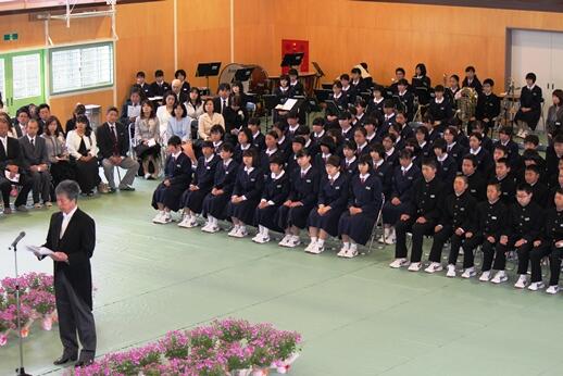 起立する姿に、緊張とともに中学校生活への期待が感じられました。歓迎