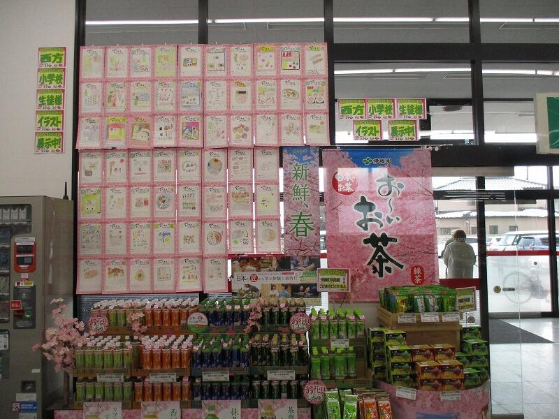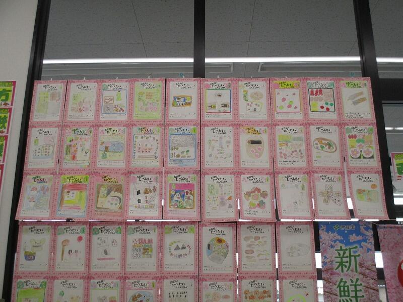 1・2年生が、冬休みなどに頑張って描いてくれた「お花見で食べたいお弁当」の絵が、スーパーオータニ西方店の入口に展示されています。