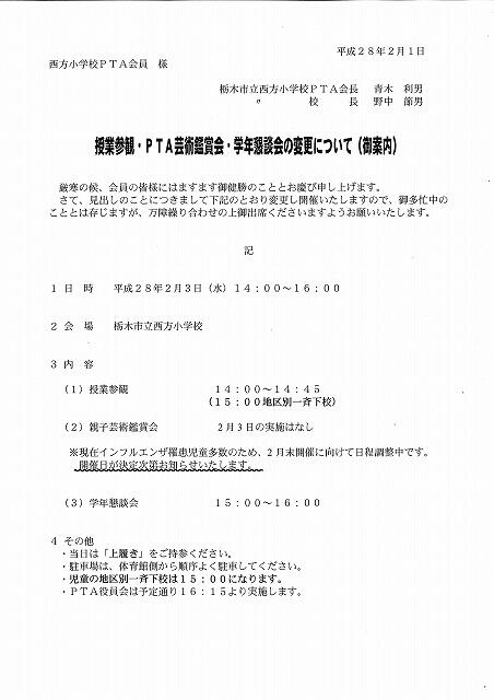また、通常より早く、13時から授業参観を予定していましたが、芸術鑑賞会が延期になったため通常日課に戻し、予定より1時間遅れの14時~14時45分に授業参観とします。