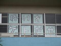 ふと、校舎を見上げると、気合いを込めたメッセージが掲示されていました。