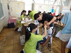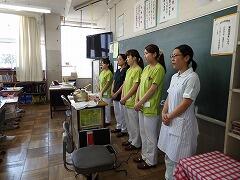 まず、よい歯の児童表彰の後、プラークテスターを歯に塗って観察用の写真を撮影しました。その後に歯みがきの仕方についての講話をいただき、個別にも指導していただきながら、歯みがきの仕方を練習しました。
