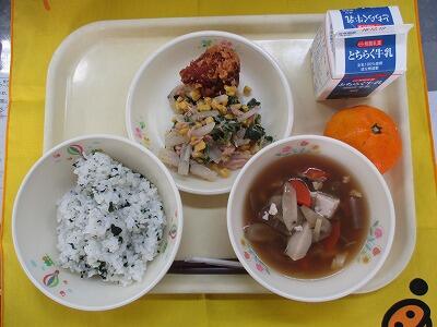 《・わかめご飯 ・牛乳 ・けんちん汁 ・ポパイサラダ ・ミカン》