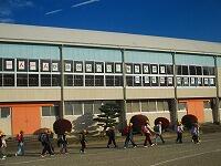 体育館の窓に、持久走のスローガンが貼られ、いよいよ大会間近の雰囲気になってきました