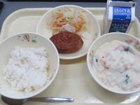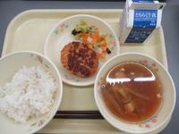 ごはん 牛乳 ハンバーグケチャップソース ゆで野菜 和風根菜シチュー
