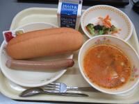 背割りコッペパン ロングフランク ケチャップ&マスタード 牛乳 こんにゃくサラダ ミネストローネ