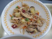 今日の給食は、いつもの五目ごはんの具に、さつまいもを追加した、甘めでおいしいおかずです