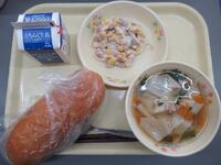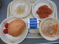 背割りコッペパン ミートサンドの具 牛乳 フレンチサラダ アルファベットスープ