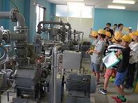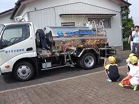 給水車を見学しています。 ポンプで配水池に水を送ります。