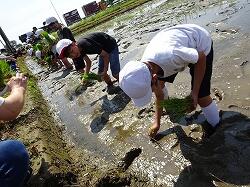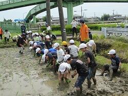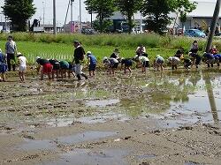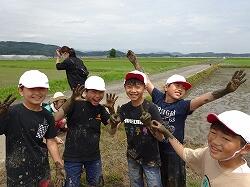 1組、2組でどちらが速く植えられるか、競い合いながら田植えをし、急ぐあまりに服が汚れた児童もたくさんいました。