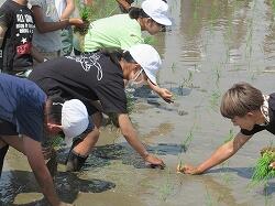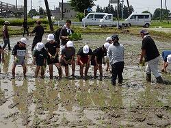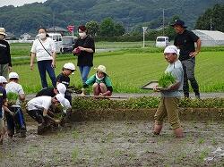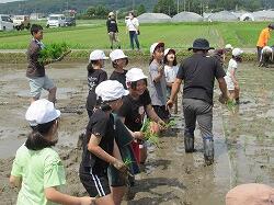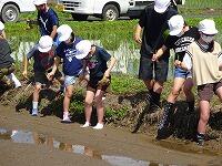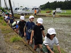 児童は、苗を手に、ずぶずぶと田に入り、指示に従って植えていきました。