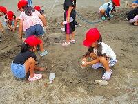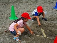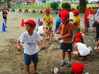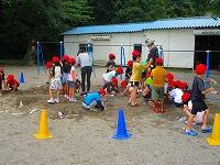 水をかけあったり、砂場に川を作って水を流したりしていて、全身びしょ濡れ、砂まみれになっていましたが、その後にお楽しみのプールがあったので、気兼ねなく思いっきり遊ぶことができました