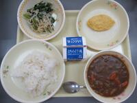 ごはん 牛乳 ビーフカレー オムレツ もち麦入りほうれん草のサラダ