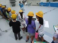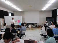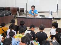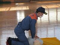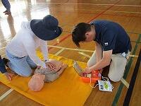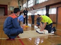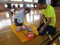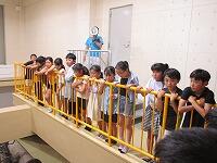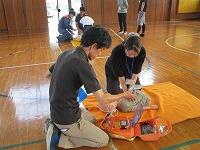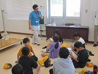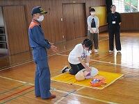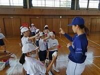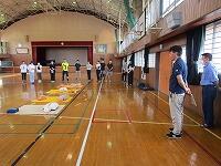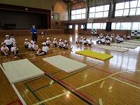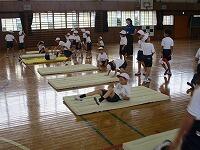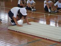 背中を丸めて小さく回ること、両手をしっかりとマットにつくこと、できるだけ後頭部をつくようにするとよいこと等、指導者が丁寧に説明をしていました。